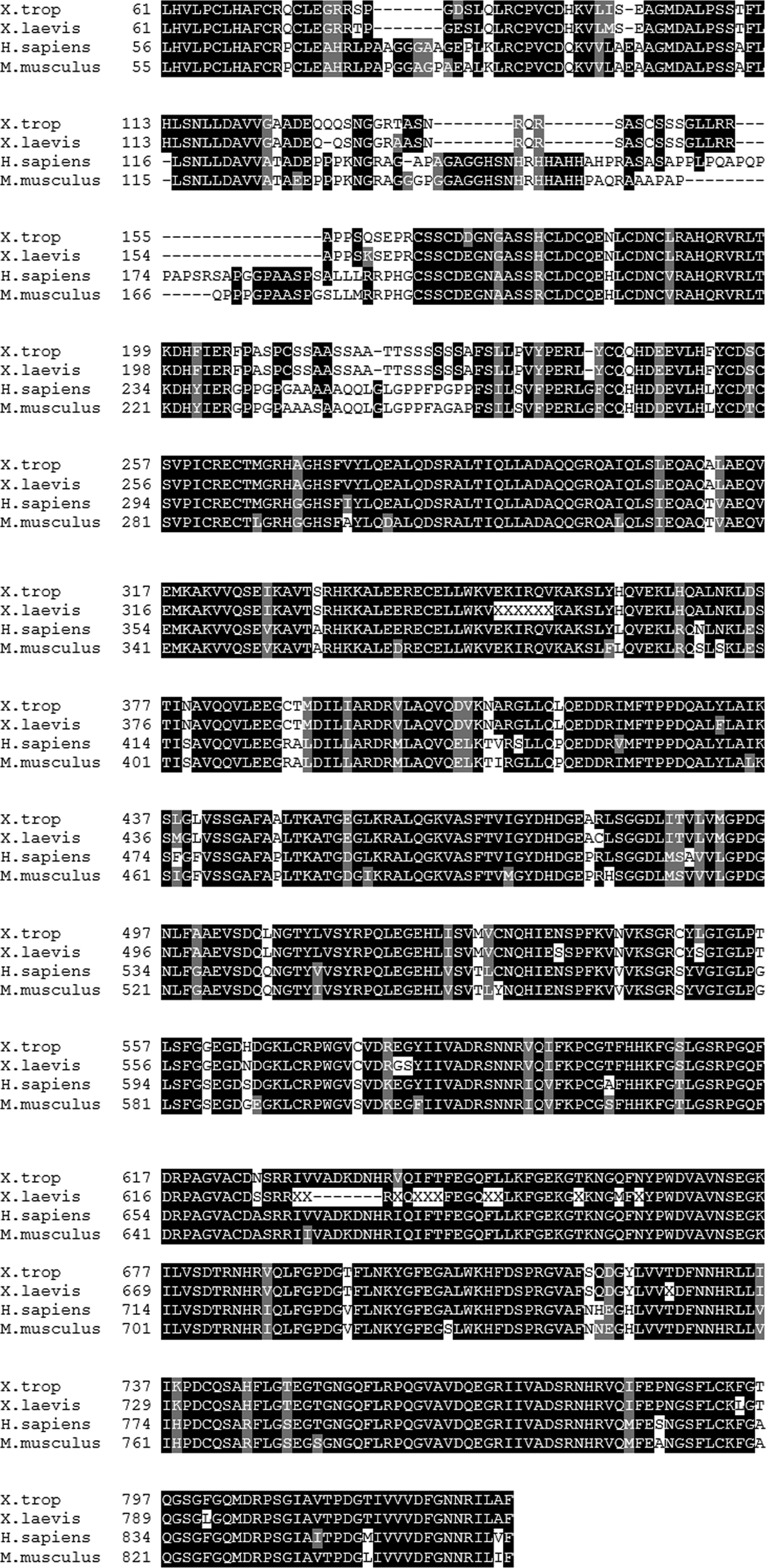 Supplementary material. Alignment of vertebrate Trim71 (Lin41 orthologues). Protein sequence alignment of the putative Xenopus laevis Trim71 (identified in this work) with mouse (NP_001035968.1), human (NP_001034200.1) and Xenopus tropicalis Trim71 (XP_002937892.1, isoform X3) sequences. |