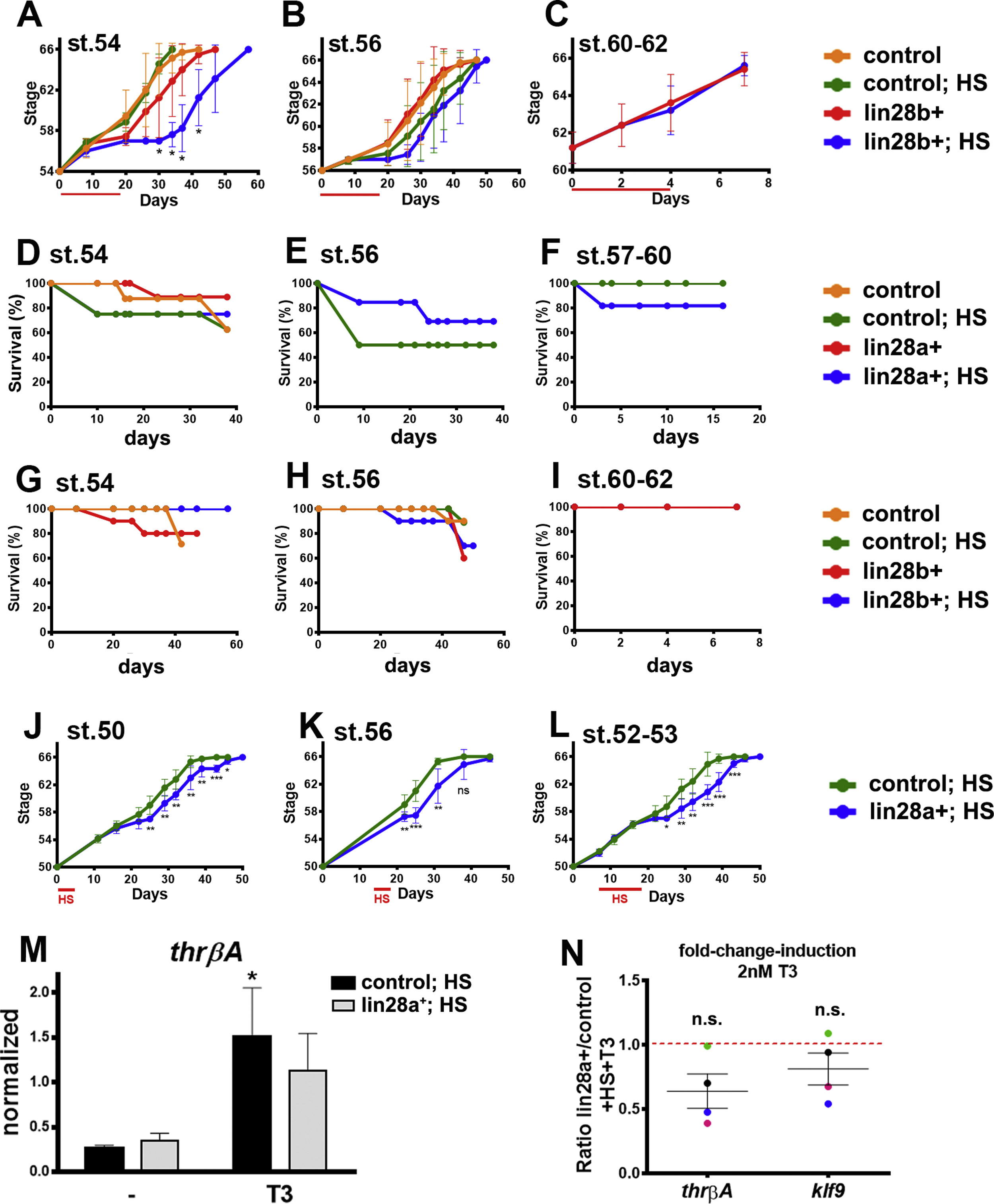 Lin28 functions upstream or in parallel to the thyroid hormone. (A-C) Control and lin28a+ animals received HS starting at (A) st.54, (B) st.56 or (C) st.57â60. Red bar indicates days of HS treatment. ANOVA plus Tukey´s multiple comparison for each day (A). *significant difference between lin28a+; HS and the other conditions simultaneously with no significant difference for the other comparisons. t-test for each day (B,C). **p<0.01, ***p<0.001. (D and E) RT-qPCR for (D) thrβA and (E) klf9 from brain samples isolated from control and lin28a+ animals with HS from day 0 to day 18 starting at stage 50. Expression was normalized to eef1αâ1 and compared to day 0 (average ±SEM, n=3 independent experiments). *p<0.05, ***p<0.001, Two-way ANOVA plus Sidak´s multiple comparisons test. (F) St.52 control and lin28a+ animals were HS for two days and incubated without or with 2 nM T3 from day 1 to day 3. Brain RNA and RT-qPCR was performed for klf9. Expression was normalized to eef1αâ1 (average ±SEM, n=4 independent experiments). **p<0.01, ***p<0.001, Two-way ANOVA plus Sidak´s multiple comparisons test for animals treated or non-treated with T3 .
