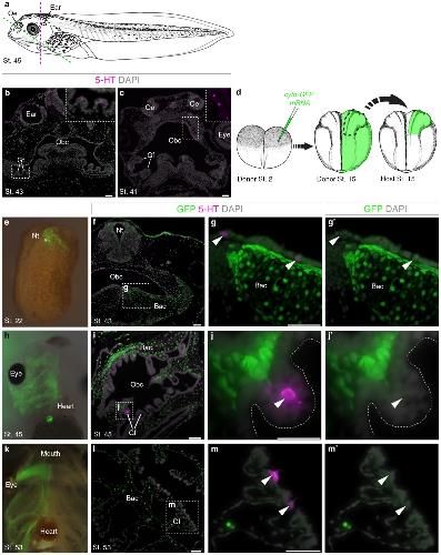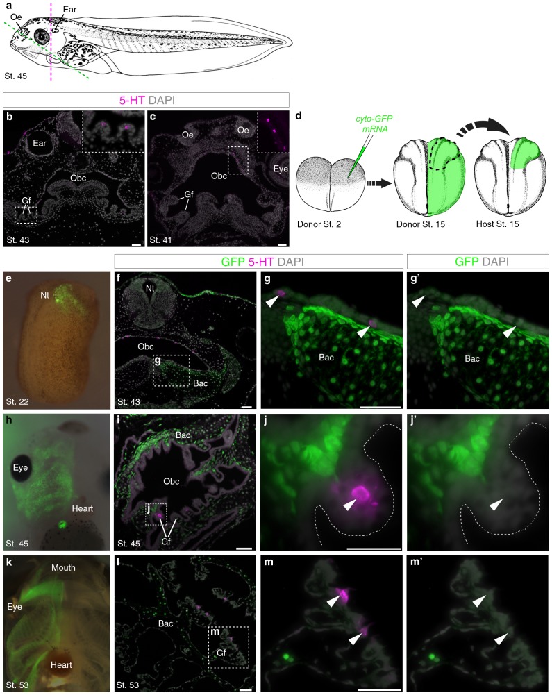 Figure 3. Putative Xenopus NECs are not neural crest-derived.(a) Schematic of a stage 45 tadpole (Nieuwkoop and Faber, 1967). Dotted lines: section planes in b,fâgâ (magenta, transverse) and in c,i-jâ,l-mâ (green, oblique). (b) Serotonergic cells in gill filament epithelium (putative NECs) are first detected at stage 43 (inset shows higher-power view). (c) Similar serotonergic cells are scattered in the orobranchial epithelium from stage 41 (inset shows higher-power view). (d) Schematic (modified from Nieuwkoop and Faber, 1967) showing neural crest labelling: GFP-donors, created by injecting cyto-GFP mRNA into one cell at the two-cell stage, were grown to stages 13â17, and neural folds grafted unilaterally to wild-type hosts. For grafted embryos grown to stage 53, donors were transgenic CMV-GFP embryos. (e) At stage 22, GFP labels neural crest cells migrating towards the branchial arches. (fâgâ) At stage 43, GFP labels branchial arch cartilage and surrounding mesenchyme, but not putative NECs (arrowheads) in the orobranchial epithelium. (hâjâ) At stage 45, GFP-positive neural crest cells are visible in the branchial arches (whole-mount and section from different embryos). GFP labels branchial arch cartilage and mesenchyme, but not putative NECs (arrowheads) in the gill filaments. (kâmâ) At stage 53 (transgenic CMV-GFP donors; whole-mount and section from different embryos), GFP labels branchial arch cartilage and mesenchyme, but not putative NECs (arrowheads) in the gill filaments. 5-HT, serotonin; Bac, branchial arch cartilage; Gf, gill filament; Nt, neural tube; Obc, orobranchial cavity; Oe, olfactory epithelium. Scale-bar: 50 μm.DOI: http://dx.doi.org/10.7554/eLife.21231.009 |