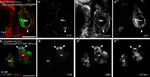 Figure 1—figure supplement 1. The promoters driving the Cre-switchable reporter cassettes are active in NECs.In 7-dpf Tg(-28.5sox10:cre);Tg(ef1a:loxP-DsRed-loxP-EGFP) (a–a’’’) and 25-dpf Tg(crestin:creERT2);Tg(-3.5ubi:loxP-GFP-loxP-mCherry) (b–b’’’) zebrafish, NECs in the gill filaments (identified by immunoreactivity for serotonin, 5-HT; arrowheads) express the un-switched reporter gene. 5-HT, serotonin; Bac, branchial arch cartilage; Gf, gill filament. Scale-bar: 25 μm.DOI: http://dx.doi.org/10.7554/eLife.21231.004 |