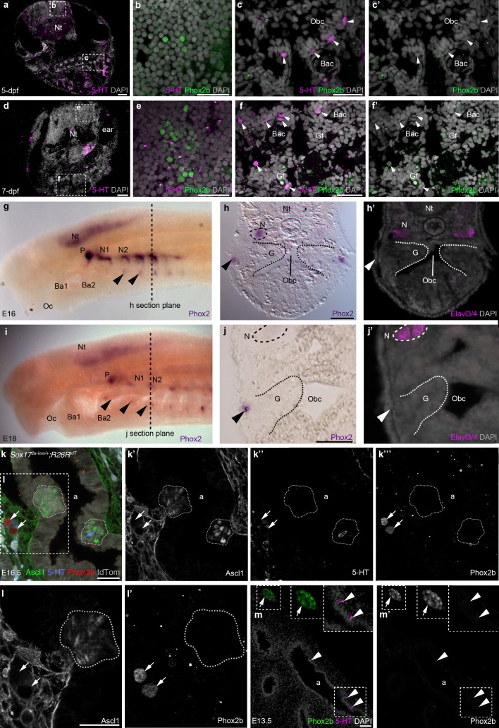 Figure 6. Phox2b expression is absent from gill and lung epithelia.(a–f’) In wild-type zebrafish at 5- and 7-dpf, Phox2b is expressed by a subset of cells in the hindbrain (b,e), but not by gill NECs or putative NECs in the orobranchial epithelium (arrowheads; c–c’,f–f’). (g–j’) At E16 (g–h’) and E18 (i–j’) in the sea lamprey, Phox2 expression is seen in the neural tube, the epibranchial (petrosal and nodose) ganglia (identified in section by the neuronal marker Elavl3/4), and in patches of ectoderm and subjacent mesenchyme ventral to the epibranchial ganglia (arrowheads). However, Phox2 expression is absent from the gill epithelium, where putative NECS would be located. Dotted lines in panels g and i indicate the section plane in h and j. (k–l’) In a section of an E16.5 Sox172A-iCre/+;R26tdTomatomouse lung, Phox2b expression is seen in intrinsic pulmonary ganglia (arrows), but not in Ascl1/serotonin-positive PNECs located in the lung airway epithelium (dotted lines outline clusters of PNECs). (m,m’) In a section of an E13.5 chicken lung, Phox2b expression is seen in an intrinsic pulmonary ganglion (arrow), but not in serotonin-positive PNECs scattered in the lung airway epithelium (arrowheads). Insets show higher power views. a, airway; Ba, branchial arch; Bac, branchial arch cartilage; G, gill; Gf, gill filament; N, nodose ganglion; Nt, neural tube; Obc, orobranchial cavity; Oc, oral cavity; P, petrosal ganglion. Scale bars: 50 μm in a,d,h,j,m; 25 μm in b,c,e,f,k,l.DOI: http://dx.doi.org/10.7554/eLife.21231.014 |