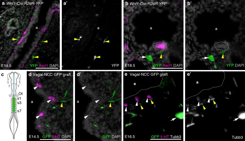 Figure 5—figure supplement 1. The neural crest does not contribute to amniote PNECs.(a–b’) Transverse sections through the lungs of Wnt1-Cre;R26R-YFP mouse embryos, in which neural crest cells are permanently labeled with YFP (Danielian et al., 1998; Srinivas et al., 2001), at E14.5 (a,a’) and E18.5 (b,b’). PNECs (Ascl1 [Mash1]-positive cells in the airway epithelium; Ito et al., 2000) are unlabeled, whether solitary or clustered (white dotted line in b,b’), although nearby neural crest-derived cells in the subjacent mesenchyme (yellow arrowheads) are YFP-positive, including putative Schwann cells on a nerve innervating the PNECs (yellow arrowheads in b,b’) and an intrinsic pulmonary ganglion (white arrow in b,b’), as expected (Freem et al., 2010). (In a,a’, the two fainter, out-of-focus green spots within the epithelium are background artefacts from the anti-GFP immunostaining.) (c) The vagal neural crest was labeled in the chicken using GFP-transgenic to wild-type neural tube grafts at E1.5 (schematic modified from Le Douarin, 2004). (d–e’) Transverse sections through the lungs of grafted embryos at E14.5 (d,d’) and E16.5 (e,e’). PNECs (serotonergic cells in the lung airway epithelium) are unlabeled (white arrowheads), while putative Schwann cells (elongated cells, yellow arrowheads) and a nearby intrinsic pulmonary ganglion (white arrow) are GFP-positive, as expected (Burns and Delalande, 2005). 5-HT, serotonin; a, airway; Ot, otic vesicle; s, somite. Scale-bars: 10 μm in a; 50 μm in b,d,e.DOI: http://dx.doi.org/10.7554/eLife.21231.013 |