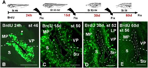 Thuret, Analysis of neural progenitors from embryogenesis to juvenile adult in Xenopus laevis reveals biphasic neurogenesis and continuous lengthening of the cell cycle. 2015, Pubmed , Xenbase