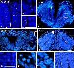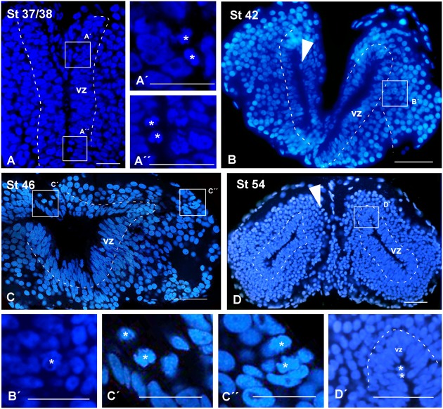 FIGURE 2. Ventricular limits and mitotic cells. Micrographs of transverse sections through the pallium of Xenopus laevis at embryonic (A,Aâ²,Aâ²â²,B,Bâ²), premetamorphic (C,Câ²,Câ²â²) and prometamorphic (D,Dâ²) stages. The DAPI staining allowed the identification of the ventricular extent (AâD), and, additionally, to examine the position of mitotic cells (Aâ²,Aâ²â²,Bâ²,Câ²,Câ²â²,Dâ²). (AâC) Are confocal images, and the higher magnifications (Aâ²,Aâ²â²,Bâ²,Câ²,Câ²â²,Dâ²) correspond to the framed areas, as indicated (white boxes in AâD). Throughout development, in ventricular layer the cells are densely packed, but the thickness of this layer was larger at early stages (A,B), than later in larval stages (C,D). At embryonic stages, ventricular mitotic cells were primarily visualized (Aâ²,Aâ²â², see arrowhead in B), but also abventricular mitotic cells were detected (see asterisk in Bâ²). During the larval period, mitotic cells were also observed in the ventricular side (asterisk in Câ²Dâ²) and abventricularly (asterisk in Câ²â² and see arrowhead in D). Scale bars = 50 μm (AâC,Aâ²,Aâ²â²), 25 μm (Bâ²,C,Câ²â²), 100 μm (D,Dâ²). See list for abbreviations. |