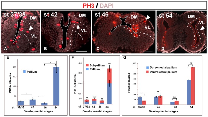 FIGURE 3. Mitotic rate. Micrographs of transverse sections through the pallium of Xenopus laevis at embryonic (A,B), premetamorphic (C) and prometamorphic (D) stages showing the distribution of PH3, marker of proliferating and mitotic cells, in combination to DAPI. During development, mitotic cells were observed in the ventricular cell layer, but also abventricularly (arrowheads in AâD). The mitotic index significantly increased at the end of the embryonic period, but it significantly decreased at early larval stages, to drastically increase later at stage 54, when a neurogenetic peak is observed (E). This pattern is observed not only in the pallium, but also when pallial and subpallial regions separately analyzed, where significant differences in their mitotic index were not observed at any stage (F). Considering separately during development the DM and the VL, major differences in their mitotic index were not observed, with the exception of the stage 37/38 when the dorsomedial proliferation is slightly higher, but it did not continue later in development (G). Scale bars = 50 μm (AâC), 200 μm (D). See list for abbreviations. ââP < 0.001, âP < 0.05. |
