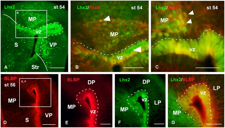 FIGURE 8. Analysis of progenitor cells at larval stages (Lhx2, Pax6, BLBP). Micrographs of transverse sections through the pallium of Xenopus laevis at the larval stage 54 showing the distribution of the progenitor markers Lhx2 (AâC,F,G), Pax6 (B,C) and BLBP (DâG). In each panel the color code for the used markers is indicated. The higher magnifications (B,E,F) are from the panels indicated in each case (white boxes in A,D). At this stage in the ventricular zone Lhx2 is expressed by virtually all cells (A,F), and those cells co-expressed Pax6 (B,C) and BLBP (G). Lhx2 expressing cells away from the ventricle, like in the medial pallium, were also labeled for Pax6 (B,C), but never expressed BLBP (G). Scale bars = 100 μm (A,D), 50 μm (B,C,EâG). See list for abbreviations. |