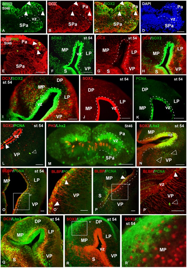 FIGURE 9. Analysis of progenitor cells at larval stages (Sox2, DCX, BLBP, PCNA, PH3). Micrographs of transverse sections through the pallium of Xenopus laevis at larval stages 46 (AâE,M) and 54 (FâL,NâR) showing the distribution of the progenitors markers Sox2 (A,C,F,H,I,J,L,N), the neuroblasts marker DCX (B,C,E,GâI,Q) and the progenitors markers Lhx2 (M,N,Q) and BLBP (O,P), and their combinations with the mitotic marker PCNA (L,O,P) and PH3 (M). In addition, the codistribution of DCX and calretinin is shown (Q). In each panel the developmental stage and the color code for the used markers are indicated. (AâE,O,P) Are confocal images, and the higher magnifications (Oâ²,Pâ²,Râ²) correspond to the framed areas, as indicated (white boxes in O,P,R). At stage 46 Sox2/DCX double labeled cells were observed in the ventricular zone and away from it (arrowheads in AâC), and DCX labeled mitotic cells away from the ventricle were observed (arrowheads in E). At stage 54 Sox2 is expressed in the ventricular and mantle zones, and cells that coexpressed DCX were observed (FâI). Close to the ventricle those Sox2 cells were mitotic cells (J,K), but the Sox2 expressing cells detected away from the ventricle were not mitotic (empty arrowhead in L). The Lhx2 expressing cells detected at larval stages were mitotic in the ventricle (M) and coexpressed Sox2 (N), but in the mantle zone they were not coexpressing PH3 (M) and were intermingled with the Lhx2 cell population (empty arowheads in N). The combination of BLBP and PCNA showed that the mitotic cells in the ventricular zone coexpressed BLBP (arrowheads in Oâ²,P,Pâ²), but not those separated from the ventricle (empty arrowhead in Pâ²). The combination of Lhx2 and DCX showed that the Lhx2 cells detected close to the adjacent vz were double labeled (Q). The combination of Sox2 to calretinin, a marker of a population of pallial interneurons, showed that there were not double labeled cells (R,Râ²). Scale bars = 50 μm (AâE,L,M,OâPâ²), 200 μm (I), 100 μm (FâK,N). See list for abbreviations. |