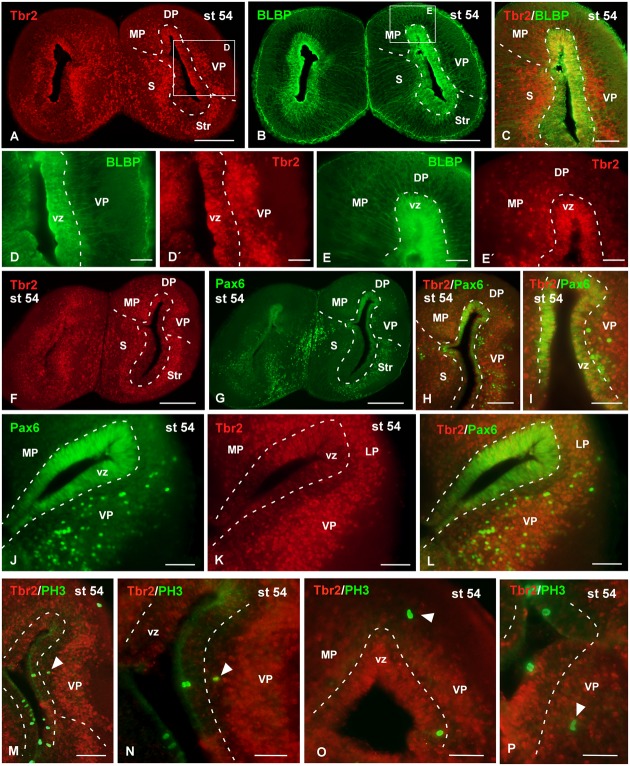 FIGURE 10. Analysis of progenitor cells at larval stages (Tbr2, BLBP, Pax6, PH3). Micrographs of transverse sections through the pallium of Xenopus laevis at the larval stage 54 showing the distribution of the markers Tbr2 (A,C,Dâ²,Eâ²,F,K), BLBP (B,C,D,E) and Pax6 (GâJ,L), and the combination of Tbr2 with the mitotic marker PH3 (MâP). In each panel the color code for the used markers is indicated. The higher magnifications (D,E) correspond to the framed areas, as indicated (white boxes in A,B). Tbr2 expressing cells were detected close to the ventricle and away from it (A,Dâ²,Eâ²,F,K) but only those cells in the ventricular zone expressed BLBP (D,Dâ²,E,Eâ²) or Pax6 (FâL). The combination of Tbr2 and PH3 showed that there are not Tbr2 mitotic cells away from the ventricle (MâP). Scale bars = 200 μm (A,B,F,G), 100 μm (C,H,JâM), 50 μm (D,E,I,N,O,P). See list for abbreviations. |