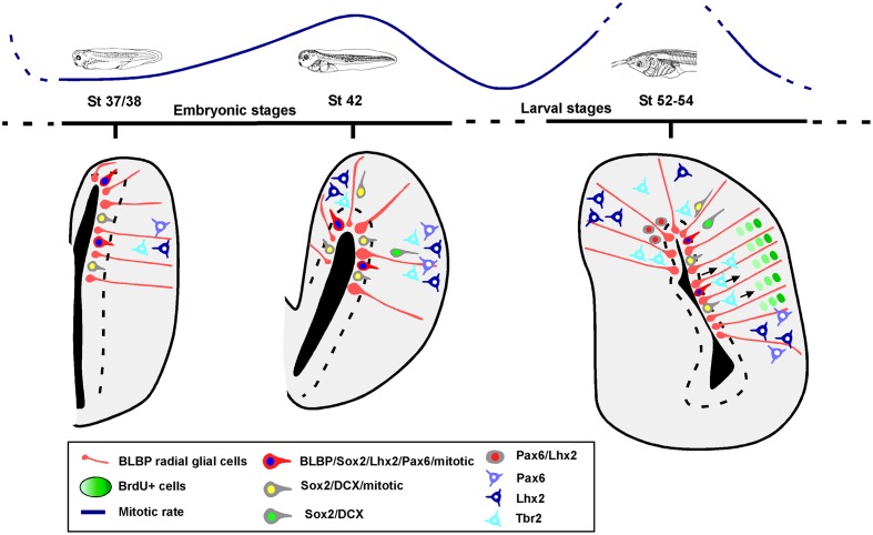 FIGURE 11. Summary diagram of the progenitor cells in the pallium of Xenopus laevis. Schematic representations showing that there are two phases of progenitor cells divisions, at mid-embryonic period and at mid-larval development. The pallial developmental order follows an outside-in pattern, in which BLBP, Pax6, Lhx2 and Sox2 are expressed in the ventricular proliferative zone and later Lhx2 and Pax6 are expressed in postmitotic cells away from the ventricle. Sox2 mitotic cells are present in ventricular and abventricular zones, and some of those cells express DCX. In the case of Tbr2, it is not expressed by mitotic abventricular cells. |