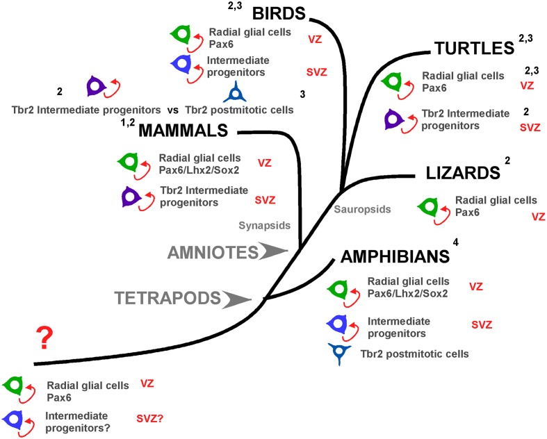 FIGURE 12. Pallial progenitor cells subtypes during evolution. Cladogram showing the pallial progenitor cells subtypes present in the different groups of tetrapod vertebrates. In mammals, the apical progenitors, or radial glial cells, proliferate and generate basal progenitors, or intermediate progenitors, which include Tbr2+ cells and specially the distinct svz, defined on the basis of the distribution of Tbr2+ cells. In birds, apical progenitors exist but there is a controversy about the nature of the basal progenitors. Nomura and collaborators (3) propose that basal progenitors and Tbr2+ cells are different cell populations. In contrast, Martínez-Cerdeño and collaborators (2) propose that birds posses a distinct svz with intermediate progenitors based on Tbr2+ expression. In lizards Tbr2 cells are present but there are not abventricular mitotic cells. In turtles there are Tbr2+ dividing cells, but a svz-like structure is only defined in the dorsal ventricular zone. Finally, in Xenopus the apical progenitors are conserved and there are abventricular mitosis, but the Tbr2+ cells are not dividing cells (present results). Thus, in evolutionary terms, the present evidences show that before the amniote evolution, in the tetrapod common ancestor subapical mitotic cells appeared and those are the origin of the basal progenitors and possible a distinct svz. 1: Martínez-Cerdeño et al., 2012; 2: Martínez-Cerdeño et al., 2016; 3: Nomura et al., 2016, 4: present results. |