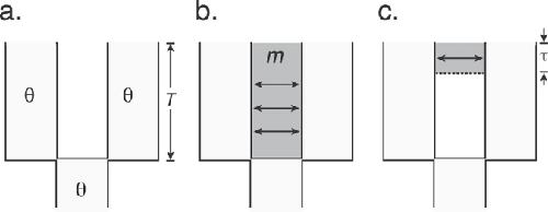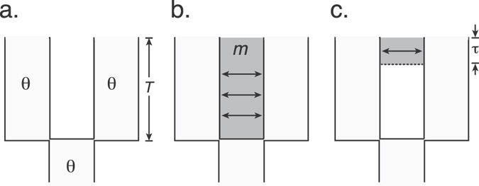 Figure 2. Evolutionary models considered for X. gilli sequence data from east and west populations included (a) population division without subsequent gene flow, (b) separation followed by ongoing gene flow, and (c) separation followed by secondary contact after a period of no gene flow. Model parameters include the population polymorphism parameter θ, which is assumed to be constant in the ancestral and both descendant populations, the time of speciation T, the amount of migration m, and the time of secondary contact τ.