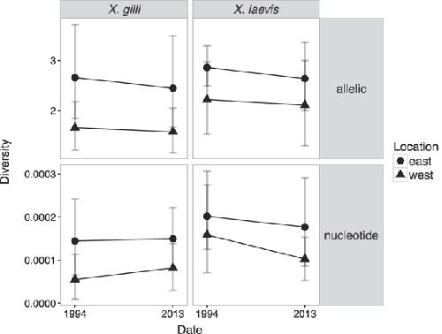 Figure 5. Genetic diversity statistics including rarefied estimates of allelic diversity (top panels) and nucleotide diversity (π) weighted by length of sequence; bottom panels). For allelic diversity, the analysis considered the same 10 loci as were analyzed by the STRUCTURE analysis (see Materials and Methods). Allelic diversity for X. laevis did not include PRMT6 locus because this locus only had four alleles for the west 1994 population.