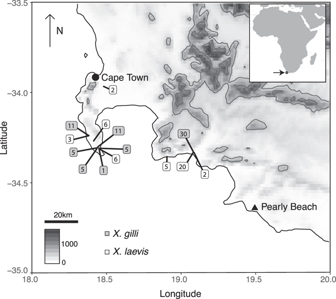 Figure 1. Sampling locations. For each species, numbers indicate the sum of number of individuals from each locality sampled in 1994 and 2013. An inset indicates the study area in southern Africa and altitude in meters is indicate on the scale. The map was made using the R package Marmap81 using topographic data from the National Oceanic and Atmospheric Administration, USA.