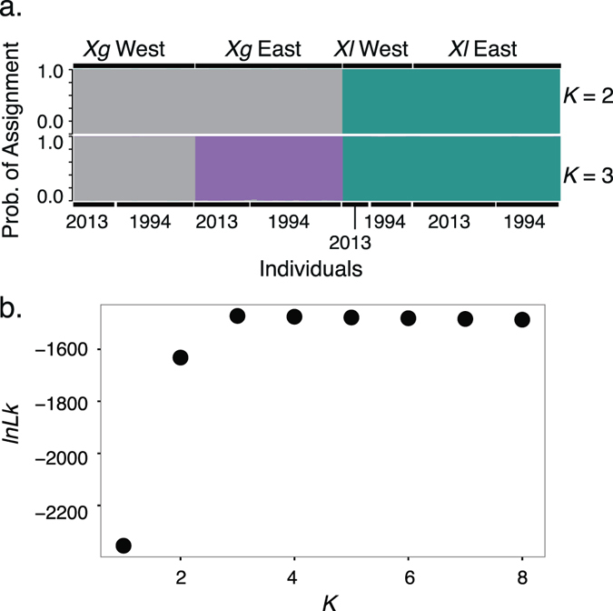 Figure 4. (a) Structure analyses for 10 loci, which had sequence data for all populations. (b) Likelihood for each value of K.