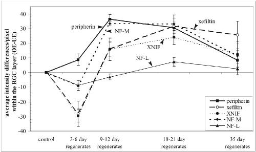Characteristic changes in the expression of neuronal intermediate filaments (nIFs), an abundant cytoskeletal component of vertebrate axons, accompany successful axon regeneration. In mammalian regenerating PNS, expression of nIFs that are characteristic of mature neurons becomes suppressed throughout regeneration, whereas that of peripherin, which is abundant in developing axons, increases. Comparable changes are absent from mammalian injured CNS; but in goldfish and lamprey CNS, expression of several nIFs increases during axon regrowth. To obtain a broader view of the nIF response of successfully regenerating vertebrate CNS, in situ hybridization and video densitometry were used to track multiple nIF mRNAs during optic axon regeneration in Xenopus laevis. As in other successfully regenerating systems, peripherin expression increased rapidly after injury and expression of those nIFs characteristic of mature retinal ganglion cells decreased. Unlike the decrease in nIF mRNAs of regenerating PNS, that of Xenopus retinal ganglion cells was transient, with most nIF mRNAs increasing above normal during axon regrowth. At the peak of regeneration, increases in each nIF mRNA resulted in a doubling of the total amount of nIF mRNA, as well as a shift in the relative proportions contributed by each nIF. The relative proportions of peripherin and NF-M increased above normal, whereas proportions of xefiltin and NF-L decreased and that of XNIF remained the same. The increases in peripherin and NF-M mRNAs were accompanied by increases in protein. These results are consistent with the hypothesis that successful axon regeneration involves changes in nIF subunit composition conducive to growth and argue that a successful injury response differs between CNS and PNS.