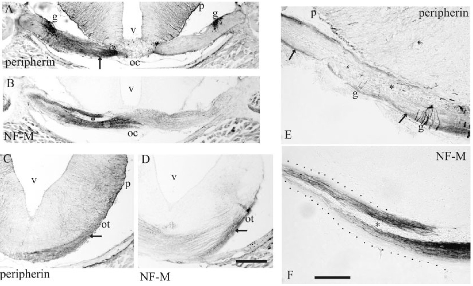 core (asterisk) stain strongly for NF-M. The degenerating core