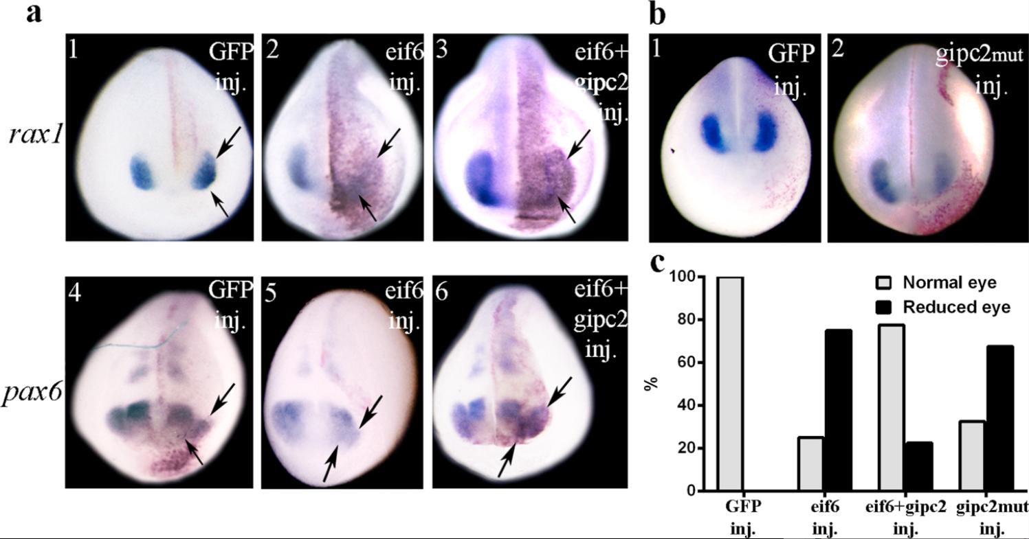 Relationship between eif6 and gipc2 expression. a. In situ hybridization performed using gipc2 anti-sense RNA on neurula injected at the 2 cell stage in one blastomere with either GFP (1 and 4), eif6 (2 and 5) or S235A (3 and 6). In GFP injected embryos (1 and 4), the hybridization intensity and pattern is identical in the embryo dorsal portion (1) and in the eye field territory (4, arrows) of both sides. In both eif6 (2 and 5) and S235A (3â6) injected samples, gipc2 is expressed at a lower level in the injected side than in the un-injected side, in particular in the eye field territory (arrows). βgal mRNA was visualized with Red-Gal. b. Real-time PCR using embryos injected with increasing concentration of eif6 (100, 200 and 400 pg) shows a highly significant (P<0.001) dose-dependent decrease of gipc2 mRNA. c. Real-time PCR in eif6 morphants showing a highly significant increase of gipc2 mRNA (P<0001) in contrast to the control mis-paired morpholino.