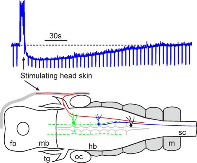 Most vertebrates show concussion responses when their heads are hit suddenly by heavy objects. Previous studies have focused on the direct physical injuries to the neural tissue caused by the concussive blow. We study a similar behavior in a simple vertebrate, the Xenopus laevis tadpole. We find that concussion-like behavior can be reliably induced by the mechanosensory stimulation of the head skin without direct physical impacts on the brain. Head skin stimulation activates a cholinergic pathway which then opens G protein-coupled inward-rectifying potassium channels (GIRKs) via postsynaptic M2 muscarinic receptors to inhibit brainstem neurons critical for the initiation and maintenance of swimming for up to minutes and can explain many features commonly observed immediately after concussion. We propose that some acute symptoms of concussion in vertebrates can be explained by the opening of GIRKs following mechanosensory stimulation to the head.