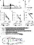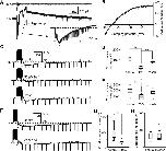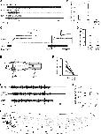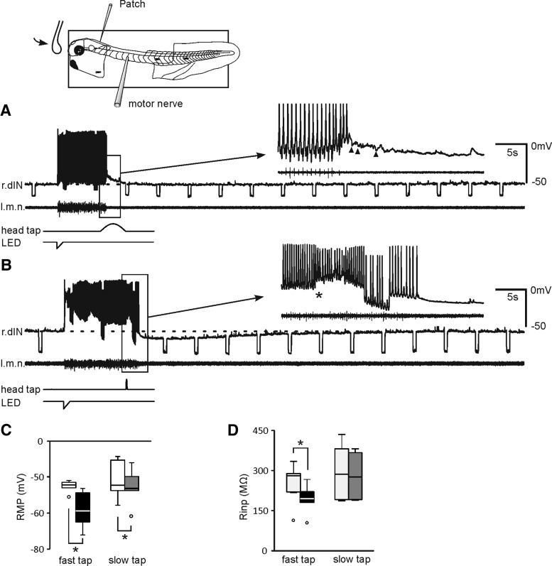 Figure 2. Responses of dINs to head taps. A, A slow tap at 0.125 Hz ends swimming (motor nerve, m.n.) and evokes a mixture of EPSPs and IPSPs (arrow heads in inset) in a dIN on the right side of the hindbrain (r.dIN). B, A fast tap at 2.5 Hz briefly excites another dIN in the right side hindbrain (*) then stops swimming with delayed, prolonged inhibition in the RMP and decreased Rinp (test steps: −100 pA). C, D, RMPs and Rinp in control (unfilled columns) and at the trough period of inhibition after taps. While slow taps at 0.125–0.25 Hz decrease RMPs in 8 dINs (from −52.2 ± 1.9 to −54.4 ± 1.9 mV, gray) without changing the Rinp, fast taps at 2.5–10 Hz in 6 dINs decrease RMPs from −52.6 ± 0.7 to −59.1 ± 2 mV with a reduction in the Rinp by 29.6 ± 8.5% (black, *p < 0.05, paired t test or related sample Wilcoxon signed rank test). Dashed lines indicate RMP in A, B. Inset on the top shows experimental setup. |