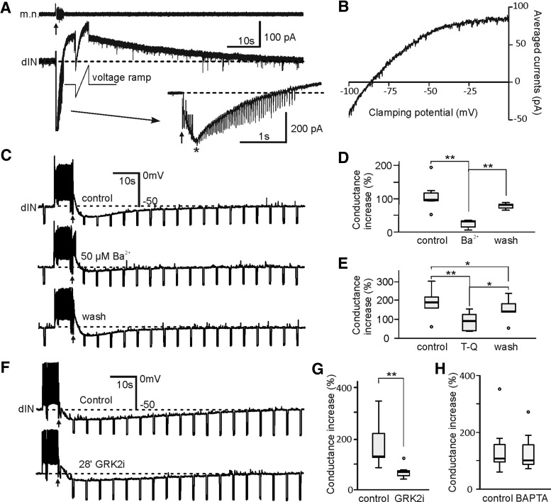 Figure 5. KO inhibition induced by electrical head skin stimulation (arrows) is mediated by GIRKs. A, A voltage-clamp recording shows the slow outward KO current and its onset (inset, *) after KO stimulation (five pulses at 30 Hz). A voltage ramp rising from −100 to 0 mV is applied at the peak of the current. Membrane potential is held at −60 mV at rest. B, I-V data points averaged from five recordings during the voltage ramp in A for estimating the reversal of the currents and their rectification. C, Effects of microperfusing 50 µM Ba2+ on KO inhibition in a dIN. D, Summary of blockade of peak conductance rises by 50–100 µM Ba2+ during KO in two dINs and six non-dINs (paired t tests). E, Microperfusing 3 µM Tertiapin-Q (T-Q) weakened the peak conductance increase during KO in one dIN and five non-dINs (paired t tests). F, One dIN recording with a pipette solution containing 10 µM GRK2i at the beginning (control) and after 28 min of equilibration. G, GRK2i weakened the peak conductance increase during KO inhibition (n = 8, paired t test). H, Summary of peak membrane conductance increase during KO in control and after BAPTA equilibration (n = 8, related samples Wilcoxon signed rank test, p = 0.33). *, significance at p < 0.05 and ** at p < 0.01 in D, E, G. Dashed lines indicate RMP or clamping current at −60 mV in A, C, F. |