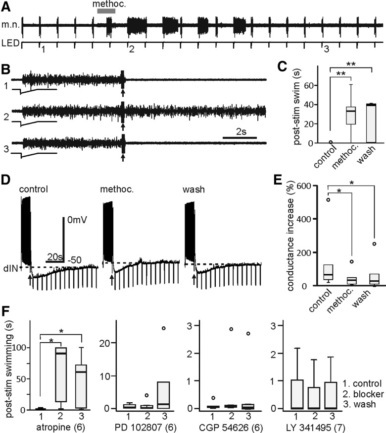 Figure 6. The pharmacological blockade of KO responses and KO inhibition. A, KO responses induced by KO stimulation (arrow, five pulses at 30 Hz) applied every 100 s. Swimming (m.n.) is evoked by dimming an LED. Gray bar indicates time of the application of 10 µM methoctramine (methoc., 100 s). B, Example KO responses before (1), shortly after methoc. application (2), and recovery (3). C, KO responses are blocked 200 s after methoc. application (p < 0.01, n = 9 tadpoles, related samples Wilcoxon signed rank test) but without recovery 25 min after wash. D, KO inhibition following skin stimulation (arrows, five at 30Hz) in a dIN is reduced by the microperfused 10 µM methoc. Swimming is initiated by dimming an LED light. E, Conductance increases during KO inhibition are weakened by methoc. (n = 6, p < 0.05, related samples Wilcoxon signed rank test). F, Summary of post-KO swimming lengths measured at 0, 200, and 2500 s from the application of different antagonists (numerals in brackets indicate number of tadpoles tested, related samples Wilcoxon signed rank tests). Atropine (10–50 µM) is a nonselective muscarinic receptor blocker. PD102807 (0.5 µM) is a selective M4 muscarinic receptor blocker. CGP54626 (10 µM) is a GABAB receptor blocker and LY341495 (10 nM) blocks mGluR II and III. *p < 0.05 and **p < 0.01 in C, E, F. |