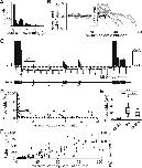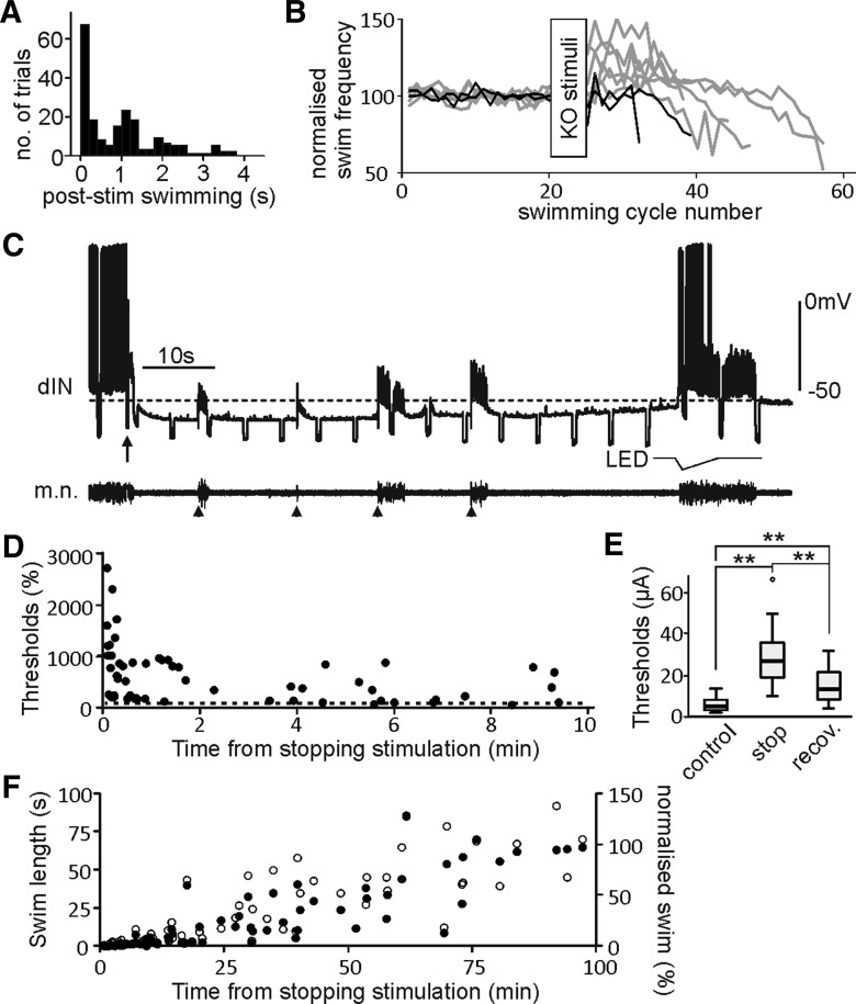 Figure 7. Swimming activity after KO stimulation. A, Distribution of swimming lengths after KO stimulation (range: 0–3.81 s, n = 197 trials). Trials are chosen from 20 tadpoles where membrane conductance during KO has increased by >100% (50/197 without swimming preceding KO). B, Normalized swimming frequency before and after KO stimuli. Gray traces are six trials with frequency increases (p < 0.05, t test, 10 post-KO swimming cycles compared with control). C, Motor responses following KO stimulation (arrow). Four single stimuli (arrow heads, 220 µA) are applied to evoke swimming during KO inhibition. Note failures in dIN spiking. D, Swimming thresholds (normalized to control, dashed line) tested with single skin stimulation after KO. E, Swimming thresholds are higher after KO stimulation and their recovery >5 min later (n = 10 sites in six tadpoles, p < 0.001, related samples Friedman’s two-way ANOVA by ranks). F, Lengths of swimming evoked by single suprathreshold skin stimulation after KO stimulation (filled circles). Empty circles show the same normalized data (secondary axis). |