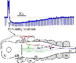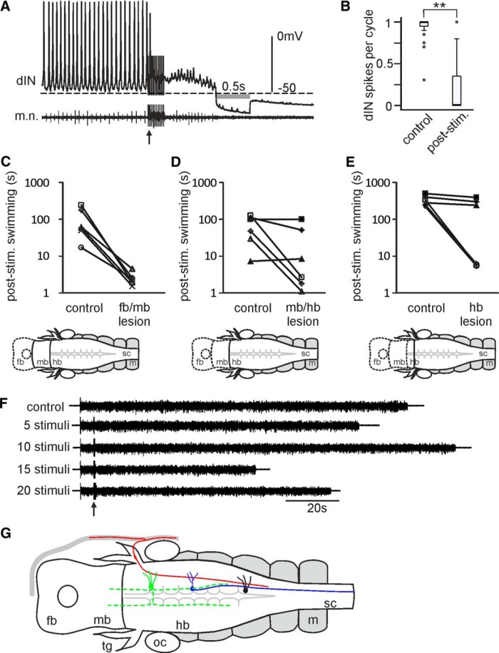 Figure 8. Locating neurons responsible for KO responses. A, A dIN recording after KO stimulation (arrow, 10 pulses at 30 Hz). Gray bar marks the Rinp-testing period. B, dIN firing reliability decreases after KO stimulation (**p < 0.001, n = 19 trials from 10 tadpoles, related sample Wilcoxon signed rank test). C, KO responses persist with lesions at forebrain and midbrain border (fb/mb). D, KO responses persist in three out of six tadpoles with lesions at the midbrain and hindbrain border (mb/hb). E, KO responses persist in three out of six tadpoles with lesions at the rostral edge of trigeminal nerve entry to hindbrain. Diagrams below bar charts in CâE show lesion locations (dashed lines outline removed brain). Each line connects averaged swimming lengths from more than five trials in control and with KO stimuli (5 at 30 Hz and 320 µA). Empty symbols show tadpoles where KO persists after lesions and filled symbols represent tadpoles with KO responses abolished by the lesion (independent samples t test or median test, p < 0.05 in each tadpole). F, Swimming of a tadpole with KO responses abolished by the lesion at the rostral edge of the trigeminal nerve entry to the hindbrain. Arrow indicates time of electrical skin stimuli. Swimming is initiated by a single electrical stimulus to the head skin. G, Diagrammatic summary of the KO pathway (dorsal view) mediating the loss of motor responses. Stimulating the head skin excites the peripherals of rapid-transient detectors (red) located in the trigeminal ganglion, which in turn activate the unidentified cholinergic interneurons (green with dashed processes) in the brainstem. The cholinergic cells inhibit the rostral dINs (blue) by opening the GIRKs coupled to M2 muscarinic cholinergic receptors. The non-dINs (black) then lose the excitatory inputs from dINs and tadpole motor responses are suppressed. For abbreviations, see Figure 3E. |