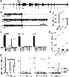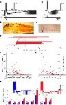 Figure 4. Properties of KO inhibition and their relation with the longitudinal location of neurons. A, KO inhibition in a dIN 468 µm from mid/hindbrain border following electrical skin stimulation (five pulses at 30 Hz, arrow). B, KO inhibition after 10 electrical skin stimuli (25 Hz, arrow) in a dIN 670 µm from mid/hindbrain border. Dashed lines indicate RMP in A, B. C, A dIN filled with neurobiotin in the hindbrain (hb, lateral view). Fb, forebrain; mb, midbrain; p, pineal eye. Black dashed lines outline the central nervous system. White dashed line marks the border between mb and hb (0 in E). D, Photo of the cell in C (white rectangle). Arrow head marks a short ascending axon. E, The distribution of somata (circles) and axons (lines) of 13 neurons with >100% peak conductance increases during KO. Dashed vertical line marks the position of obex. F, Longitudinal location of neurons plotted against their peak conductance increases during KO (48 dINs, 25 non-dINs, p < 0.001, two-tailed Spearman rank correlation coefficient 0.58). G, KO inhibition amplitudes plotted against conductance increases (p < 0.0001, correlation coefficient 0.834). In E–G, red symbols represent dINs; black symbols represent non-dINs. Hollow symbols are from tap experiments and solid ones from electrical skin stimulation. H, Increasing the number of electrical skin stimuli (numerals above bars) while maintaining the stimulation strengths and frequencies induces larger rises in the membrane conductance in 10 dINs. The recordings from one dIN are shown in insets. |