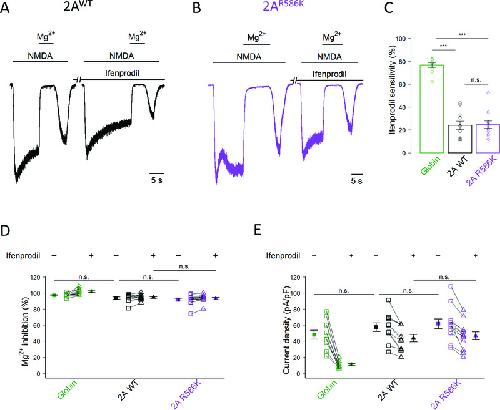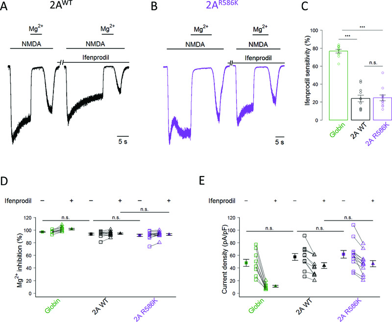 in vitro (DIV) 9 neurons transfected with an inert control, GluN2AWT or GluN2AR586K, showing inhibition of current evoked by saturating NMDA (150 μM) by Mg2+ (1 mM) before and after one minute of ifenprodil (3 μM) application. Holding potential –65 mV. Responses are normalised to the peak amplitude. (C) Summary data showing percentage inhibition by ifenprodil, recorded from neurons as shown in