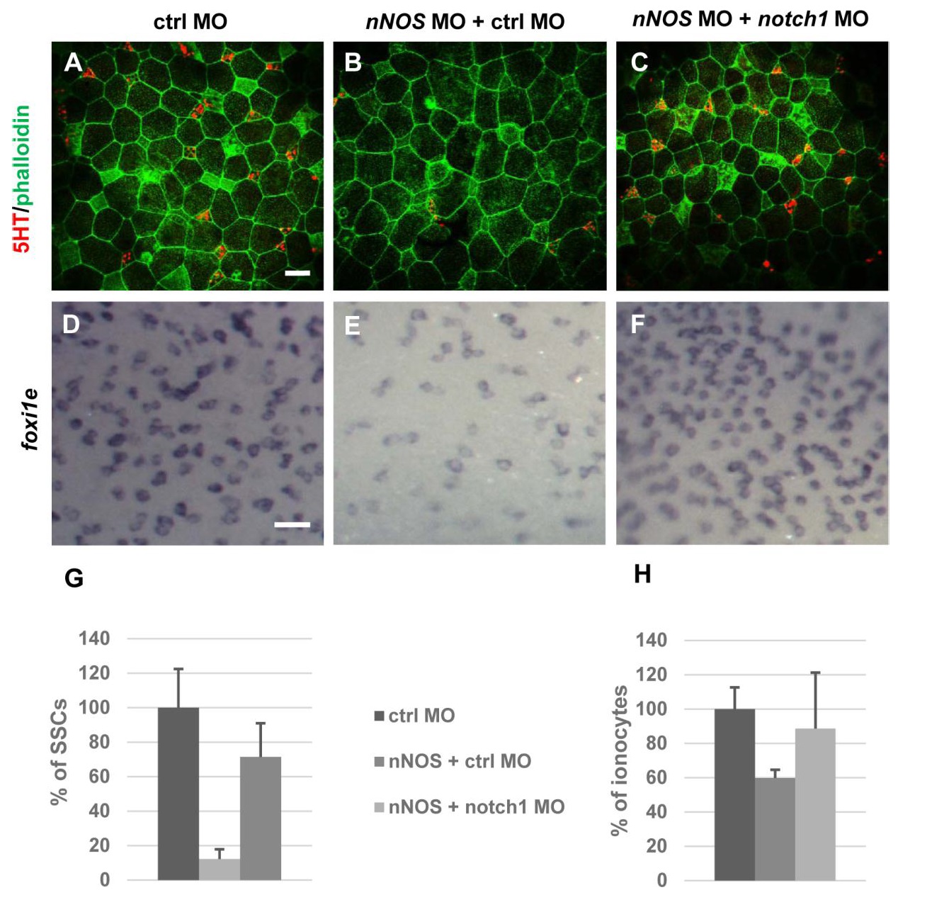 Fig. 6. Partial restoration of the quantity of ionocytes and SSCs by notch1 MO Embryos were injected by ctrl MO 34 ng (A,D), nNOS MO 17 ng + ctrl MO 17 ng (B,E) and nNOS MO + notch1 MO (1:1, 17 ng + 17 ng) (C,F) at stage 1 and fixed in 4% PFA at stage 30 (A,B,C) and 40 (D,E,F). SSCs were labeled by anti-5HT and membranes by antibody against phalloidin and imaged (apical surface of the embryonic epidermis) by confocal microscopy (magnification 40x, scale bar = 20 μm) (A,B,C). Ionocytes were marked by foxi1e probe (D,E,F). Magnification 11,25x, scale bar = 50 μm. Injection of nNOS MOS (B,E) cause reduction in number of SSCs (B,G) and ionocytes (E,H). Combination of MO cause partial restoration of the quantity of ionocytes and SSCs (C,F,G,H). Quantification of incidence of SSCs (G) and ionocytes (H), error bars indicate + s.d., the P-value was < 0,0002 (ctrl x nNOS + ctrl MO), < 0,13 (ctrl x nNOS + notch1 MO), < 0,005 (nNOS + ctrl x nNOS + notch1 MO) (G), < 0,2 (ctrl x nNOS + ctrl MO), < 0,7 (ctrl x nNOS + notch1 MO) < 0,35 (nNOS + ctrl x nNOS + notch1 MO) (H). At least 5 embryos were used for each condition (One-way ANOVA, Tukey´s multiple comparisons test). |