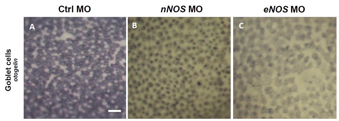 Fig. S3. Changes at otogelin in embryos with inhibited NO production Ctrl MO 34 ng (A), nNOS MO 17 ng (B) and eNOS MO 34 ng (C) were injected at stage 1 and fixed in 4% PFA at stage 26. Goblet cells were marked by otogelin (A-C) and imaged by macroscope (magnification 11,25x, scale bar = 50 μm). At least 5 embryos were used for each condition. |