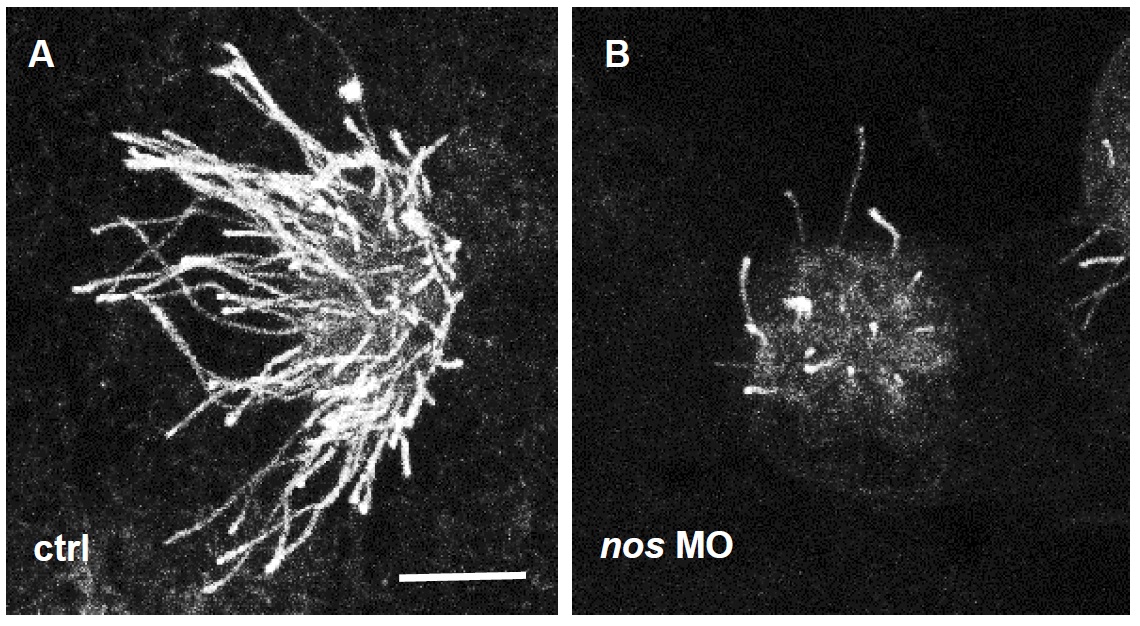 Fig. S4. Inhibition of NO causes structural defects in MCCs Embryos were injected by ctrl MO 17 ng (A) and nNOS MO 17 ng (B) at stage 1 and fixed in 4% PFA at stage 35. MCCs were stained by antibody against anti-alpha tubulin and imaged (apical surface of the embryonic epidermis) by confocal microscopy (magnification 40x, scale bar = 20 μm) Injection of nNOS MOS (B) cause structural defects in MCCs in embryos at stage 35. At least 5 embryos were used for each condition. |