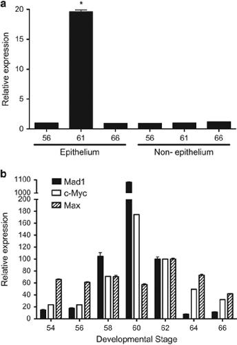 Figure 2. Mad1 is strongly upregulated specifically in the epithelium of the intestine at the climax of metamorphosis when epithelial apoptosis and adult stem cell development take place. (a) The expression of Mad1 was analyzed by RT-PCR on total RNA from the isolated epithelium and non-epithelium (the rest of the intestine) of X. laevis tadpoles at indicated stages during development. (b) Both Mad1 and c-Myc are upregulated, whereas Max expression changes little during intestinal remodeling. The expression of Mad1, c-Myc, and Max was analyzed by RT-PCR on total RNA isolated from whole intestine of X. laevis tadpoles at indicated stages during development. The mRNA level for Mad1, c-Myc and Max was normalized against that of EF1α RNA. The data are shown in arbitrary unit as the mean±S.E. (n=3). The statistical significance was determined by one-way ANOVA followed by Tukey’s multiple comparison test (*P<0.05)