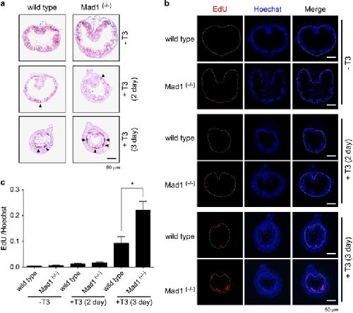 Figure 7. Mad1 knockout enhances intestinal epithelial cell proliferation during T3-induced metamorphosis. Premetamorphic stage 54 tadpoles were treated with 5ânM T3 for 0, 2 or 3 days and were killed 30âmin after EdU injection. (a) Cross-sections of the intestine from the resulting tadpoles were stained for MGPY. Note there were more epithelial cells in clusters strongly stained by MGPY in the cross-sections of the intestine from Mad1 (â/â) tadpoles treated with T3 for 3 day compared with wild-type ones. Arrowheads indicate the clusters of epithelial cells. (b) Cross-sections of the intestine from the tadpoles were double-stained for EdU (cell proliferation) and with Hoechst (DNA). Again, there are more EdU-positive epithelial cells in clusters in the T3-treated Mad1 (â/â) tadpole intestinal cross-sections compared with the wild-type ones. The dotted lines depict the epitheliumâmesenchyme boundary. Scale bar, 50âμm. (c) Cell proliferation is significantly increased in Mad1 (â/â) tadpoles treated with T3 for 3 day compared with wild-type ones. Red colored EdU positive areas in epithelium were measured and normalized against the total cellular area in epithelium determined by Hoechst staining. The statistical significance of the differences was determined by Studentâs t-test (*P<0.05)