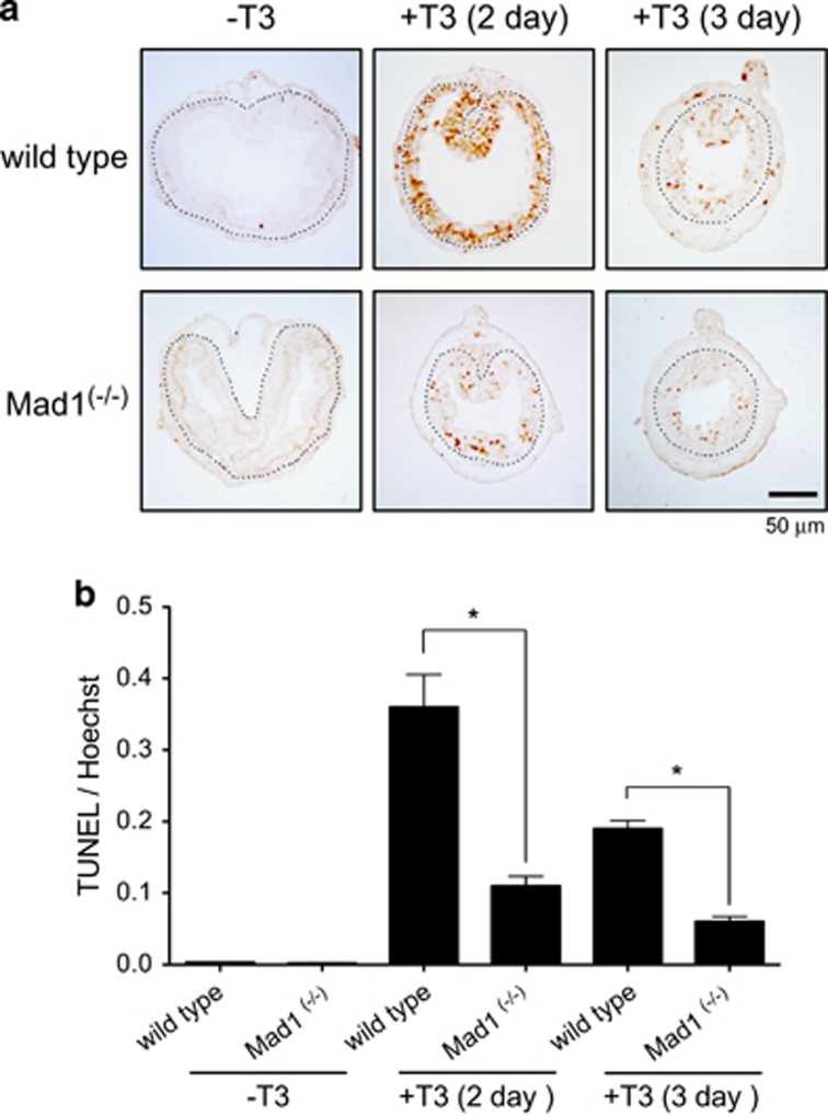 Figure 8. Mad1 knockout inhibits cell death in the epithelium during T3-induced metamorphosis. (a) Cross-sections of the intestine of premetamorphic stage 54 tadpoles treated with 5 nM T3 for 0, 2 or 3 days were stained for apoptosis by TUNEL. Note that apoptosis in the epithelium peaked after 2 days of T3 treatment and that there were more intestinal epithelial cells in wild-type animals strongly stained by TUNEL compared with the ones in Mad1 (−/−) tadpoles. The dotted lines depict the epithelium–mesenchyme boundary. Scale bar, 50 μm. (b) Quantitative analysis of apoptosis by counting TUNEL-positive areas in the epithelium and normalized by the total cellular area in epithelium determined by Hoechst staining