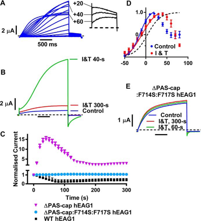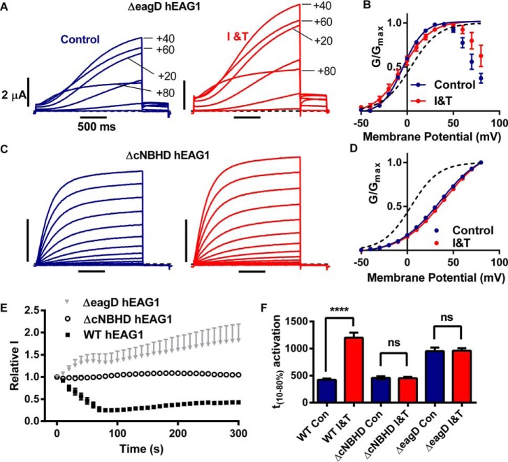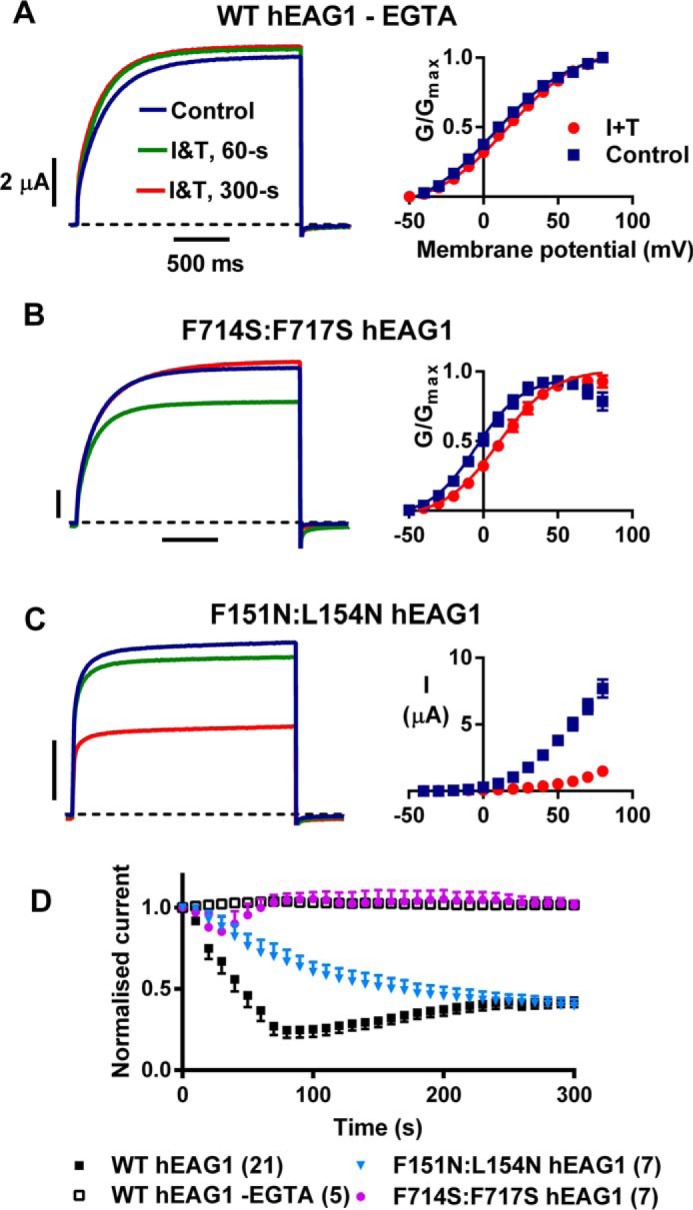 The ether à go-go family of voltage-gated potassium channels is structurally distinct. The N terminus contains an eag domain (eagD) that contains a Per-Arnt-Sim (PAS) domain that is preceded by a conserved sequence of 25-27 amino acids known as the PAS-cap. The C terminus contains a region with homology to cyclic nucleotide binding domains (cNBHD), which is directly linked to the channel pore. The human EAG1 (hEAG1) channel is remarkably sensitive to inhibition by intracellular calcium (Ca(2+) i) through binding of Ca(2+)-calmodulin to three sites adjacent to the eagD and cNBHD. Here, we show that the eagD and cNBHD interact to modulate Ca(2+)-calmodulin as well as voltage-dependent gating. Sustained elevation of Ca(2+) i resulted in an initial profound inhibition of hEAG1 currents, which was followed by a phase when current amplitudes partially recovered, but activation gating was slowed and shifted to depolarized potentials. Deletion of either the eagD or cNBHD abolished the inhibition by Ca(2+) i However, deletion of just the PAS-cap resulted in a >15-fold potentiation in response to elevated Ca(2+) i Mutations of residues at the interface between the eagD and cNBHD have been linked to human cancer. Glu-600 on the cNBHD, when substituted with residues with a larger volume, resulted in hEAG1 currents that were profoundly potentiated by Ca(2+) i in a manner similar to the ΔPAS-cap mutant. These findings provide the first evidence that eagD and cNBHD interactions are regulating Ca(2+)-dependent gating and indicate that the binding of the PAS-cap with the cNBHD is required for the closure of the channels upon CaM binding.