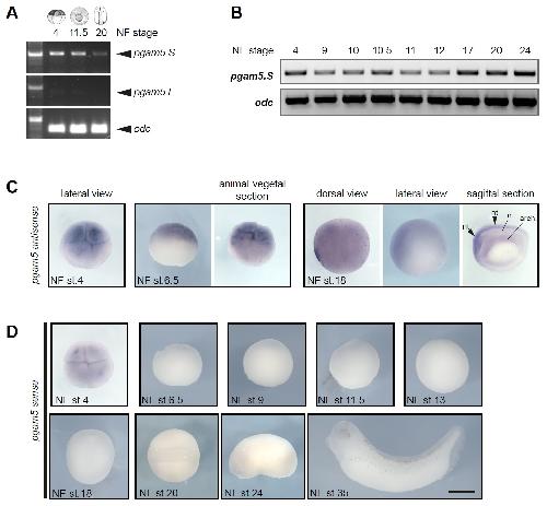 Supplementary Figure 3 (A) Transcripts of pgam5.S and pgam5.L homeologs were amplified by RT-PCR from whole embryos of the indica-ted stages; ornithine decarboxylase (odc) was used as house-keeping gene. The arrows indicate the expected fragment size. In contrast to pgam5.S, transcripts of pgam5.L were barely detectable and only in stage 4 embryos. (B) pgam5.S transcripts were present maternally (NF stage 4) and throughout early embryonic development (NF stages 9-24). (C) Supplementary in situ hybridization data. Maternal pgam5.S transcripts were detected predominantly in the animal blastomeres at NF stage 4 (8-cell stage) and at early blastula stage 6.5. At stage 18/19 pgam5 was broadly expressed in the dorsal ectoderm and the neural tube (nt). A sagittal section showed that expression was strongest in the anterior neural tube and gradually decreased towards posterior (arrowheads indicate neural tube (nt), n â notochord, arch. â archenteron). The archenteron cavity appears stained due to trapped dye. (D) Sense controls corresponding to images in (A) and in Figure 3A. |