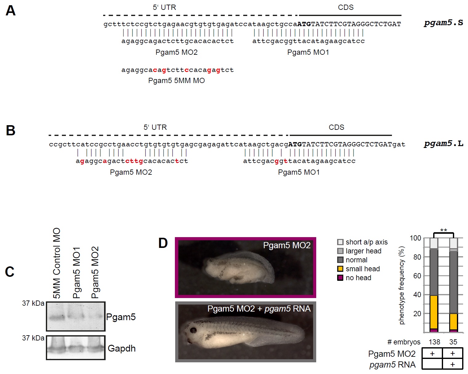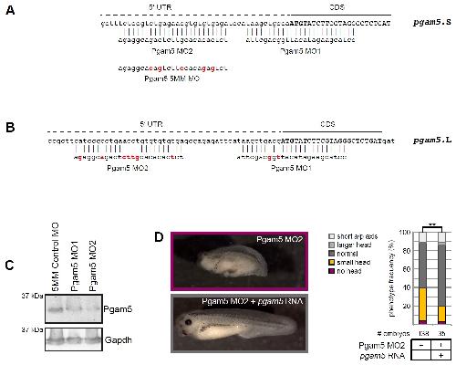 Supplementary Figure 4 (A) Translation-blocking antisense morpholino oligonucleotides were used to knock-down Pgam5 in Xenopus laevis embryos. Pgam5 MO1 and Pgam5 MO2 target two non-overlapping sites in pgam5.S transcripts at and close to the translation start respectively. The alignment shows the binding sites of MO1 and MO2 to the pgam5.S mRNA and base exchanges in the Pgam5 5-mismatch Control MO. (B) Alignment of Pgam5 MO1 and Pgam5 MO2 to pgam5.L. Pgam5 MO1 aligns with only two mismatches also to pgam5.L and therefore MO1 can be expected to suppress also translation from pgam5.L. The sequence in pgam5.L corresponding to the Pgam5 MO2 binding site contains seven nucleotide exchanges, therefore Pgam5 MO2 is not expected to affect pgam5.L translation. (C) Injection of either Pgam5 MO1 or Pgam5 MO2 into both blastomeres at the two-cell stage resulted in knock-down of Pgam5 at stage 11.5. (D) Representative phenotypes of embryos injected with 0.4 pmol Pgam5 MO2 or co-injected with MO-insensitive pgam5 RNA as indicated. Co-injection of pgam5 RNA rescues the phenotype of Pgam5 morphant embryos. Frequencies of phenotypes from at least three independent experiments are summarized in the graph; the total numbers of embryos are provided below each column. The Ï2-test was used for statistical analysis (** p-value < 0.01). |