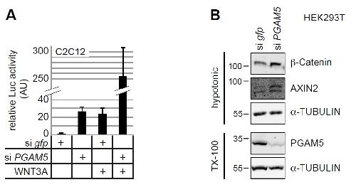 Supplementary Figure 6 (A) Knock-down of PGAM5 by siRNA transfection strongly enhanced responsiveness of murine C2C12 cells to WNT3A stimulation as determined by TOP-Flash reporter gene assays normalized to β-Galactosidase. (B) PGAM5 knock-down in HEK293T cells resulted in stabilization of cytoplasmic β-Catenin and upregulation of the feedback target AXIN2. |