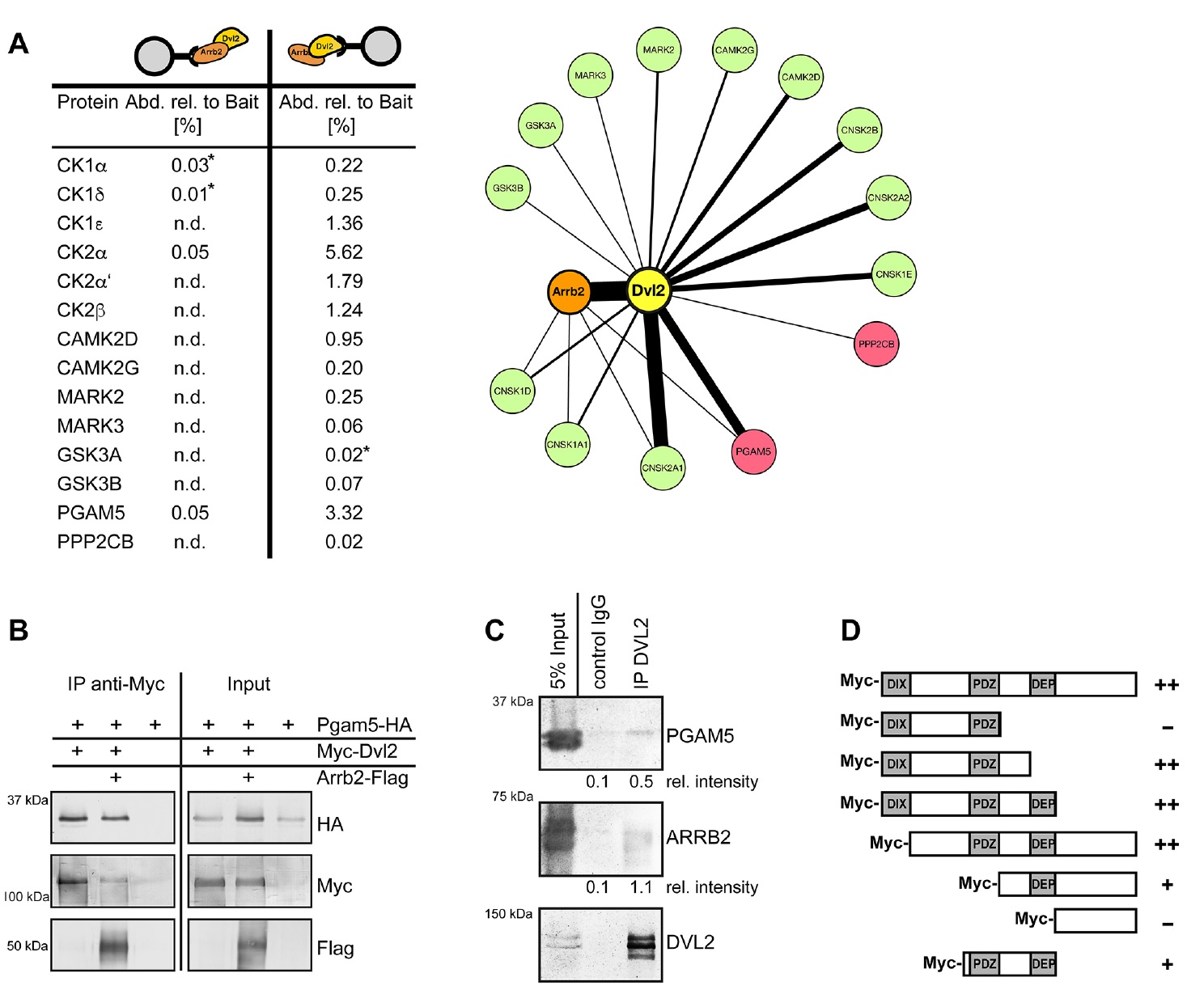 Fig. 1. Pgam5 physically interacts with Arrb2 and Dvl2. (A) Interactome analysis by quantitative HPLC-MS-MS with Arrb2 as a bait and the corresponding back-tagging experiments yielded various protein kinases and identified Pgam5 as a novel binding partner of Dvl2 and Arrb2. Relative abundances are summarized. Asterisks indicate that proteins were detected in only one biological replicate. The interaction network with selected preys was illustrated using Cytoscape; the bait proteins Dvl2 and Arrb2 are colored yellow and orange, respectively; kinases are shown in green; phosphatases in red. The line width indicates the abundance of the respective preys relative to Dvl2 or Arrb2 as bait. (B) Co-immunoprecipitation of overexpressed proteins confirms the interaction of Pgam5 with Dvl2 and the Dvl2-Arrb2 complex. (C) Endogenous co-immunoprecipitation of human PGAM5 and ARRB2 with DVL2. Band intensities have been quantified and relative intensities are given below the respective blots. (D) The binding site of Pgam5 to Dvl2 was mapped to the region interspacing the PDZ and DEP domains of Dvl2 by co-immunoprecipitation of Pgam5-HA with a series of truncated Myc-Dvl2 constructs, as illustrated. |
