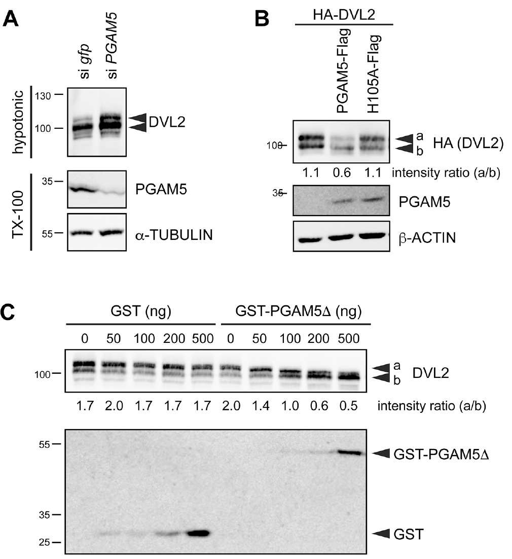Fig. 2. DVL2 is a substrate of PGAM5. (A) Knockdown of PGAM5 in HEK 293T cells was sufficient to induce hyperphosphorylation of DVL2. (B) Overexpressed HA-DVL2 yielded two distinct bands on western blots. Co-expression of PGAM5-Flag visibly diminished the slower migrating, hyperphosphorylated band, whereas the phosphatasedeficient mutant PGAM5-H105A-Flag did not affect electrophoretic mobility of HA-DVL2. (C) Cell lysates were incubated with recombinant GST (control) or GST-tagged PGAM5δ (lacking the N-terminal mitochondrial targeting sequence) for 30 min. In the presence of recombinant GST-PGAM5δ, DVL2 was gradually dephosphorylated. For B and C, intensities have been quantified and the ratio between the hyperphosphorylated band (a) and the faster-migrating band (b) is provided below the corresponding blots. |