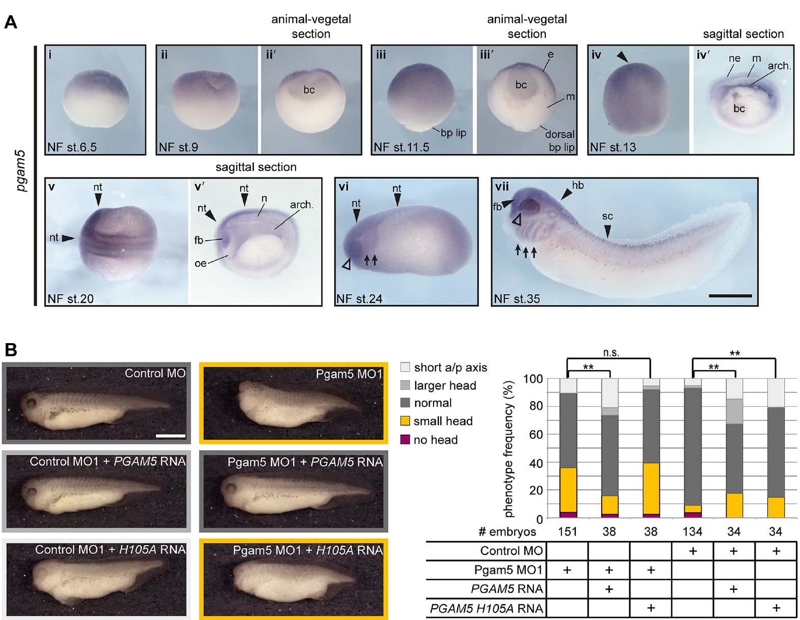 Fig. 3. pgam5 is expressed in the anterior neuroectoderm and is required for head induction in Xenopus laevis. (A) pgam5 mRNAwas detected by wholemount in situ hybridization in Xenopus embryos at Nieuwkoop and Faber (NF) stages 6.5 (i), 9 (ii,iiâ²), 11.5 (iii,iiiâ²), 13 (iv,ivâ²), 20 (v,vâ²), 24 (vi) and 35 (vii). Expression was detected in the animal ectoderm at blastula stages and was more ubiquitous from gastrula to early tadpole stages, although strongest in the anterior neuroectoderm. At stage 35, pgam5 was detected in the central nervous system (arrowheads), neural crest (arrows), eye (open arrowhead), otic vesicle and weakly in the ventral part of somites. Scale bar: 500 μm. arch., archenteron; bc, blastocoel; bp, blastopore; e, ectoderm; fb, forebrain; hb, hindbrain; m, mesoderm; n, notochord; ne, neuroectoderm; nt, neural tube; oe, oral evagination; sc, spinal cord. (B) Phenotypes of embryos injected with 0.4 pmol Pgam5 MO1 or control MO in both blastomeres at the two-cell stage followed by injection with 100 pg PGAM5 or PGAM5-H105A RNA (H105A RNA) into both dorso-animal blastomeres at the eight-cell stage. Scale bar: 500 μm. The frequencies of the indicated phenotypes from at least three independent experiments with the indicated total numbers of embryos are summarized in the graph (**P<0.01, Ï2-test; n.s., not significant). |
