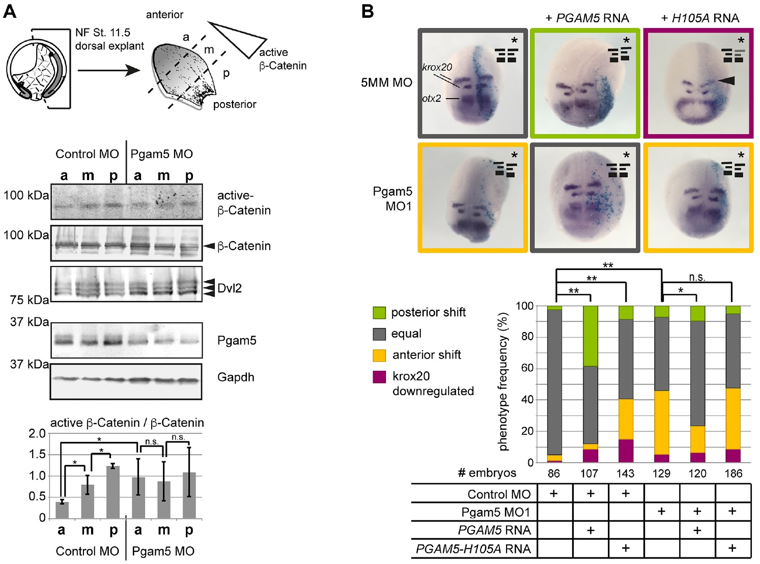 Fig. 5. Pgam5 is required for anterior inhibition of Wnt/β-Catenin signaling and ectodermal anterior-posterior patterning. (A) The prospective neural plate was explanted from embryos injected with 0.4 pmol Pgam5 MO1 or controlMOat NF stage 11.5 and dissected into anterior, mid and posterior thirds as indicated in the schematic. Active dephosphorylated β-Catenin (ABC) was detected in an anterior to posterior gradient in lysates from control dorsal explants. The blots show one representative experiment; data in the graph are average ratios±s.d. of ABC/β-Catenin from four independent experiments (*P<0.05, separate variances t-test). (B) Embryos were injected into one dorsal blastomere at the four-cell stage with 0.4 pmol Pgam5 MO1 or control MO, pCS2+ lacZ as lineage tracer and PGAM5 RNAor PGAM5-H105ARNAas indicated.Embryoswere stained for β-galactosidase to identify the injected side (asterisk) and analyzed for the expression of krox20 and otx2 at NF stage 21 by in situ hybridization. Images show representative embryos; the corresponding pattern is schematically shown in the upper right corner. The graph summarizes the results from five independent experiments (**P<0.01, *P<0.05, n.s. not significant, Wilcoxon-Rank-Sum test). |