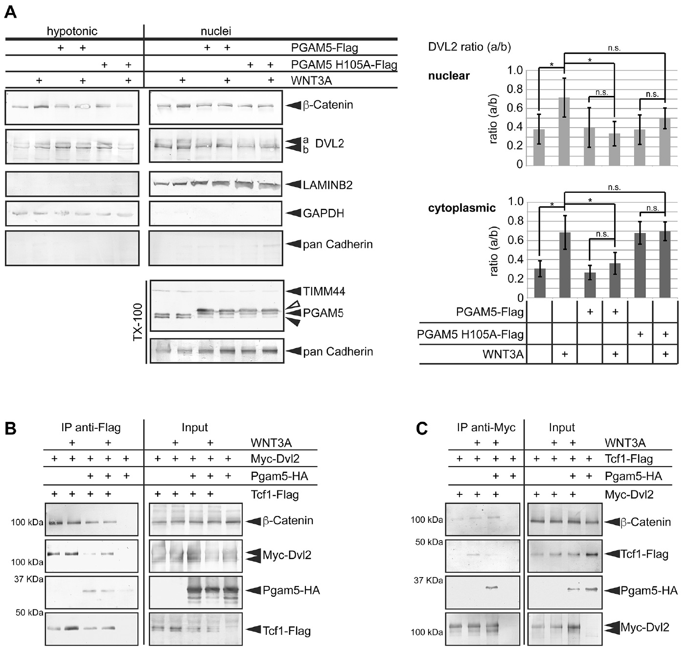 Fig. 8. PGAM5-mediated dephosphorylation inhibits nuclear function of DVL2. (A) Endogenous β-Catenin and DVL2 were detected in the cytoplasmic and nuclear fractions from WNT3A stimulated HEK293T cells transfected as indicated. GAPDH, LAMIN-B and pan-Cadherin were used as markers for cytoplasm, nuclei and membrane fractions, respectively. The ratio between the hyperphosphorylated band (a) and the faster migrating band (b) of DVL2 in nuclear and cytoplasmic fractions are plotted in the graph (data are average±s.d. from at least three independent experiments; *P<0.05; n.s., not significant; separate variances t-test). (B) In whole-cell lysates of HEK293T cells, Xenopus Tcf1-Flag co-precipitated with overexpressed Myc-Dvl2 and endogenous β-Catenin irrespective of WNT3A stimulation. Co-expression of Pgam5-HA strongly reduced interaction between Tcf1-Flag, Myc-Dvl2 and endogenous β-Catenin; WNT3A stimulation moderately enhanced interaction of Tcf1 with Dvl2, but not β-Catenin in the presence of exogenous Pgam5. (C) In the inverse co-immunoprecipitation experiment Myc-Dvl2 was immunoprecipitated. The WNT3A-induced interaction of Tcf1-Flag with Myc-Dvl2 was blocked by co-expression of Pgam5. |