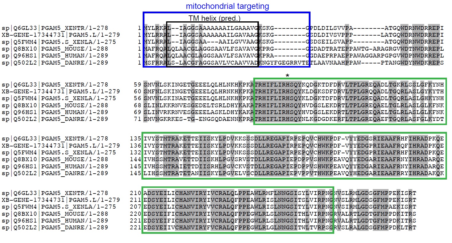Supplementary Figure 1 Alignment of Xenopus tropicalis Pgam5, Xenopus laevis Pgam5.S and Pgam5.L to the zebrafish, human and mouse orthologs (Uniprot Accession Numbers X. tropicalis Pgam5 Q6GL33, X. laevis Pgam5.S Q5FWM4, X. laevis Pgam5 was translated from XB-GENE-17344731, D. rerio Pgam5 Q502L2, H. sapiens PGAM5 Q96HS1, M. musculus Pgam5 Q8BX10). Identical amino acids are shaded grey. The boxes mark functional features: blue – mitochondrial targeting sequence (Lo and Hannink, 2008), black: predicted transmembrane helix, green – PGAM domain. Histidine 105 (human numbering) in the catalytic center is labeled with an asterisk. |