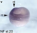 pgam5 (PGAM family member 5, serine/threonine protein phosphatase, mitochondrial) gene expression in Xenopus laevis embryo, assayed via in situ hybridization, NF stage 20, dorsal view, anterior left. |