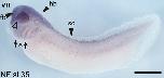 pgam5 (PGAM family member 5, serine/threonine protein phosphatase, mitochondrial) gene expression in bissected Xenopus laevis embryo, assayed via in situ hybridization, NF stage 11.5, horizontal view, dorsal right. |