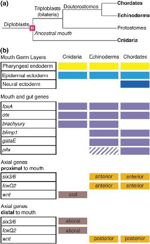 Figure 3. Ancestral mouth was present in the common ancestor of cnidaria and triploblasts. (a) Phylogenetic tree. Chordates, echinoderms, and cnidaria are three distantly related phyla that retain common mouth characteristics, suggesting that the mouth evolved once. (b) Criteria used to evaluate mouth evolution. The mouths of cnidaria, echinoderms, and chordates are all comprised of ectoderm and endoderm and express foxA and otx. There are phylum-specific characteristics such as neural ectoderm contributing to the chordate mouth and the expression of blimp1, gataE , and pitx in echinoderm and chordates. Analysis of axial positioning genes demonstrates that the cnidarian oralâaboral axis is equivalent to the echinoderm and chordate posteriorâanterior axis. |