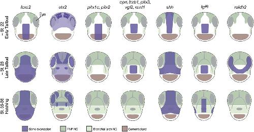 Figure 4. Relationship of the extreme anterior domain (EAD) and neural crest (NC) to the Xenopus mouth. Branchial arch (BA, light green) NC, and frontonasal prominence crest (FNP, dark green) delaminate from the dorsal neural tube (NT) at neurula. The EAD (red outline) is specified including cells arising from the anterior neural ridge (ANR, black outline) and cement gland (CG, brown) tissue. The EAD (purple) will contribute to the lining of the mouth (as well as the nostrils and anterior pituitary). FNP NC migrates anteriorly between the eyes to enter the face while first BA NC migrates bilaterally into the face (late neural-mid tailbud). Subsequent to NC ingress, EAD ectoderm thins and lengthens to become the âpre-mouth arrayâ (early-mid tailbud). NC cells eventually differentiate to form the facial skeleton, including the palate, maxilla, mandible, and connective tissue. |