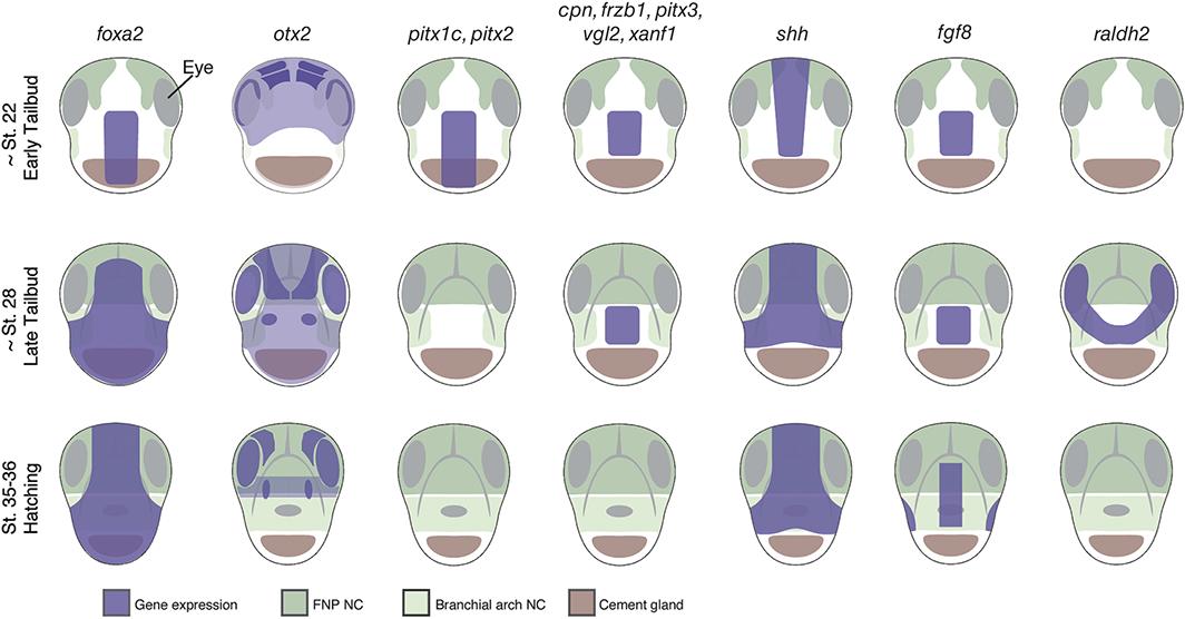 Figure 5. Extreme anterior domain (EAD) gene expression domains in Xenopus. Frontal views of Xenopus tadpole embryos. Selected gene expression domains are shown that include the EAD. These include pitx1c, pitx2, pitx3, vgl2, xanf1, cpn, frzb1, shh, fgf8, and raldh2. See text for details on their function in mouth development. |